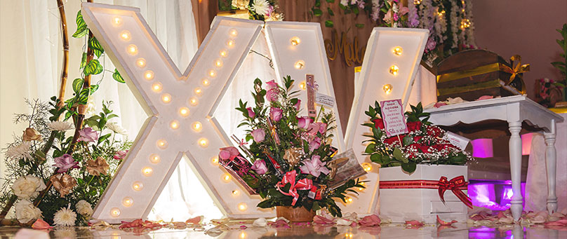 Some traditions that you may want to implement are the “changing of the shoes” when your guest of honor will change from flats to heels symbolizing the shift from being a girl into becoming a woman. Other traditions to consider are “the last doll” and the presentation of a rosary and a bible during the celebration, both given by either the parents or godparents. Other roles to coordinate are the damas and the chambelanes as well as their outfits to match the theme. The attire of the guest of honor is almost a very formal dress and in addition will be wearing a tiara.The last doll usually will match this.